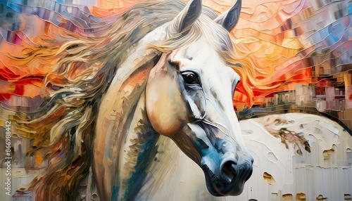 A white horse will only be visible from the neck up, its white mane will wrap around its face. It looks like a mythical creature from a magical world.