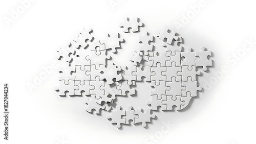 A white jigsaw puzzle being assembled with scattered pieces, symbolizing the complex process of problem-solving and finding a solution