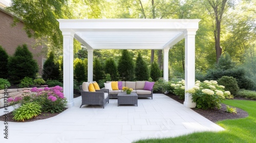 A white pergola with square columns provides shade over patio furniture. Grey chairs and a sofa with colorful pillows are arranged around a small table. Lush landscaping surrounds the patio. The phot