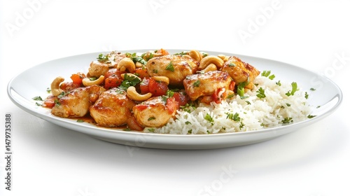 A white plate filled with tender chicken sauted with cashew nuts and steamed rice, presented on a clean white background