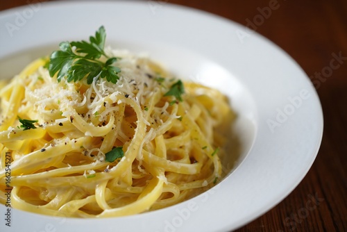 spaghetti, parsley, pasta, dish, bowl, plate, food, cheese, sauce, white