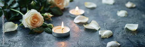 A white rose and candle on black slate background with copy space for designs,