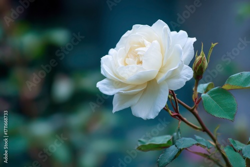 A white rose is captured with a blurry green background showcasing its petals bud stem and leaves