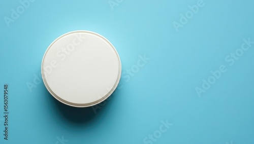 round, white, disc, object, container, cosmetic, cream, jar, cardboard box, simple, product, design, minimalist, studio, light, blue, background, top, view, flat, isolated, modern, clean, empty, blank, circle, surface, three-dimensional, rendering