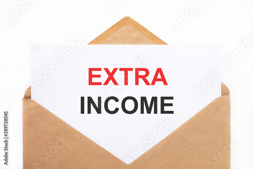 A white sheet with the text extra income lies in an open craft envelope on a white background with copy space. Business concept image