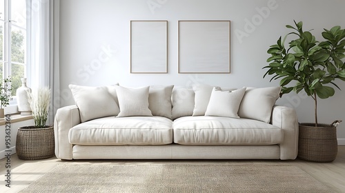 A white sofa with pillows and a plant in a wicker basket sits in front of a white wall with two empty picture frames.