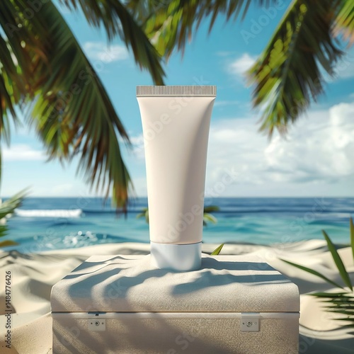 A white sunscreen tube sits on a cooler with a palm tree-lined beach and ocean in the background, with waves gently crashing onto the shore.