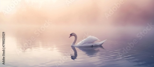 A white swan in a foggy lake at dawn. Morning lights. Romantic background. A beautiful swan. Romantic concept