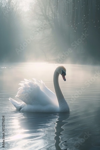 a white swan on a lake at sunrise