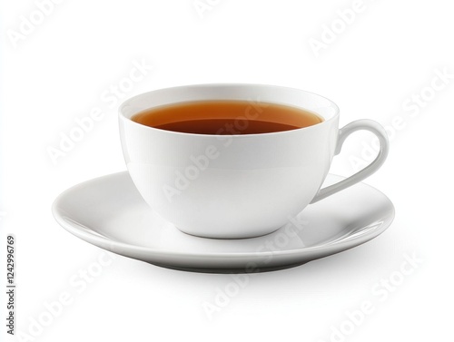 tea, cup, saucer, beverage, drink, hot, warm, caffeine, breakfast, morning, afternoon, comfort, relaxation, white, ceramic, porcelain, mug, liquid, brown, amber, delicious, refreshment, healthy, energy, vitality, aroma, scent, steam, cosy, home, office, table, tableware, kitchen, food, photo, isolated, background, white background, studio, image, picture, illustration, graphic