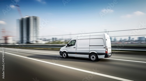 van, city, highway, skyline, white, driving, background, highrise, skyscraper, vehicle, expressway, urban, road, city landscape, building, transportation