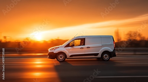 A white van is driving down the street at speed with a blurred background in the color of a yellow sunset. Concept of cargo transportation, goods delivery
