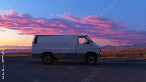 A white van parked on a roadside during sunset, with colorful clouds in the sky.