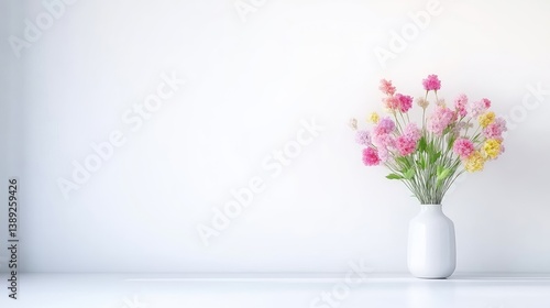 A white vase filled with colorful flowers standing on a minimalist white table against a plain white wall, and bright and clean interior design concept.