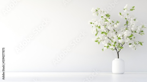 A white vase with delicate blossoming branches on a minimalist white table, simple and elegant floral arrangement, and bright and airy indoor setting.