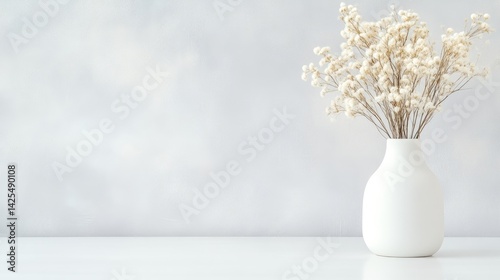 A white vase with dried flowers on a minimalist white table against a soft grey background, and elegant and serene home decor composition.