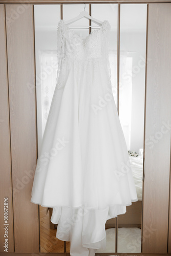 A white wedding dress is hanging on a clothes hanger in a bedroom. The dress is long and has a lot of sparkles on it
