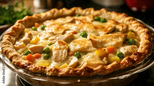 A whole chicken pot pie, its flaky crust covering a creamy filling of diced chicken and vegetables, fresh out of the oven. A savory homemade meal