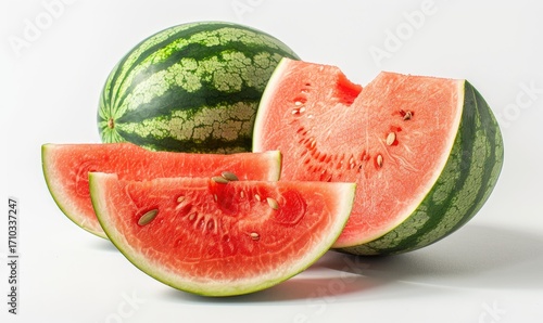A whole watermelon and two cut slices, showcasing its vibrant red flesh, black seeds, and dark green rind, rest on a stark white background