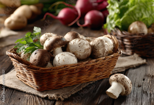 A wicker basket brimming with fresh brown and white mushrooms sits on a rustic wooden table, alongside sprigs of parsley and blurred background of other vegetables. : Generative AI