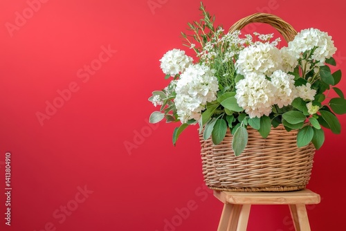 basket, wicker, hydrangea, white, flower, wildflower, greenery, plant, arrangement, bouquet, floral, spring, summer, nature, decoration, home, decor, still life, red, crimson, background, wooden, stool, sitting, display, composition, light, soft, pastel, natural, organic, texture, pattern, decorative, detail, design, beauty, fresh, fragrant, elegant, simple, peaceful, calm, romantic