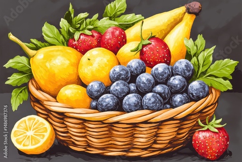 basket, wicker, fruit, banana, strawberry, grape, yellow, red, purple, blue, green, leaf, fresh, juicy, ripe, colourful, vibrant, still life, healthy, delicious, sweet, tart, summer, autumn, nature, bounty, abundance, harvest, vitamin, mineral, antioxidant, organic, natural, food, dessert, snack, breakfast, lunch, dinner, painting, illustration, artwork, image, picture, graphic, visual, design, composition