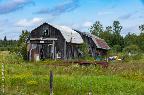 A wide angle view of a dilapidated farm building. Neglected wood barn in a state of disrepair surrounded by rural farmland, with copy space to right