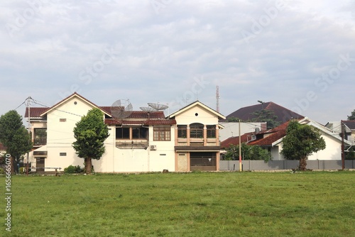 A wide shot of a suburban neighborhood showcasing traditional Indonesian houses with red-tiled roofs, large satellite dishes, and white-painted walls facing an open green field. The architecture blend