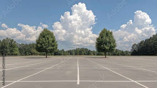 parking, lot, tree, cloud, sky, nature, landscape, empty, space, asphalt, line, scenery, green, blue, summer, calmness, solitude, environment, rural, horizon, sunlight, shadow, park, leisure, calm, peaceful, open, area, huge, expansive, clear, day, weather, bright, tranquil, serene, natural, beauty, setting, distance, view, scene, outdoors