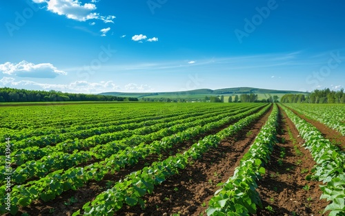 A wide view of an expansive potato field under the bright sun, with rows upon rows neatly lined up with vibrant green potatoes, captured in crisp detail against a clear blue sky.