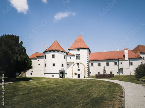 A wide view of Varazdin Castle surrounded by greenery and blue skies in Croatia. The Renaissance fortress stands as one of the country’s best-preserved historic architectural treasures.