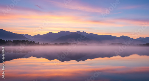 A wide-angle panoramic view of a misty mountain range at sunrise, with vibrant pastel sky and soft reflections in a lake—serene, nature-driven editorial look