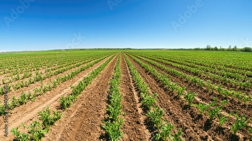 A wide-angle view of a carrot field under a clear blue sky, with rows of vibrant green plants stretching out. Perfect for rural landscape and farming visuals.