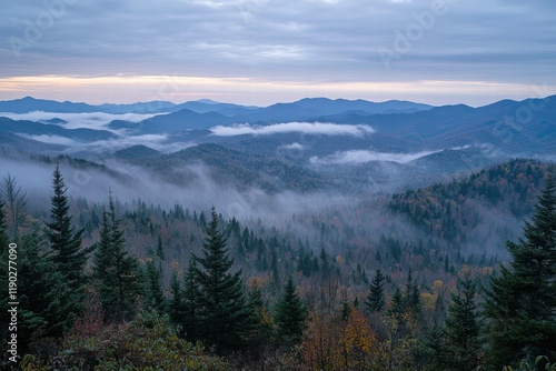 A wide-angle view of a cloudy sky over a mountain range, with soft mist and fog rolling over the peaks