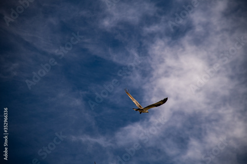 A wild Wyoming Osprey flying with a blue and white background.