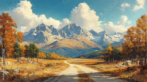 A winding dirt road leads through a valley towards a majestic mountain range with snow-capped peaks, surrounded by autumn foliage under a bright blue sky with fluffy clouds.