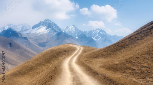 A winding dirt road leads through majestic mountains under a clear blue sky, inviting adventure and exploration in nature.
