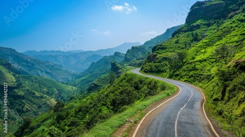 A winding mountain road snaking through lush green hillsides under a clear blue sky, perfect for scenic drives.