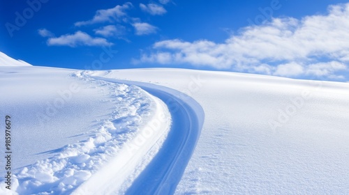 snow, path, winter, landscape, white, blue, sky, cloud, nature, horizon, mountain, glacé, cold, track, footprint, pristine, untouched, serene, peaceful, calm, quiet, empty, huge, stillness, fresh, clean, bright, sunshine, sunlight, day, clear, wind, ice, frost, icy, glacier, arctic, snowy, trail