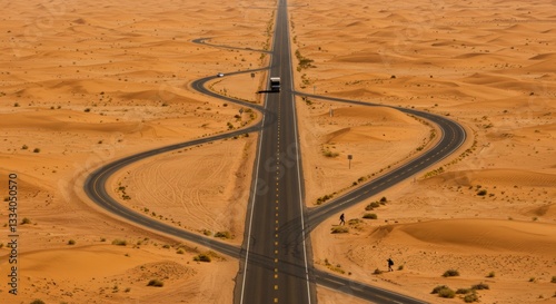 A winding road through a vast desert landscape, showcasing the contrast between asphalt and sand dunes - crossing paths