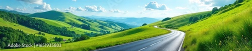 A winding scenic road cuts through a vibrant landscape, lush green hills rolling into the distance under a bright blue sky Perfect for travel, adventure, and nature themes , horizon, summer