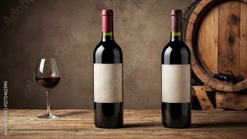 A wine bottle mockup with a blank label space for custom design. The bottle is elegant, placed on a wooden table or in a rustic wine cellar with soft lighting for a warm ambiance.