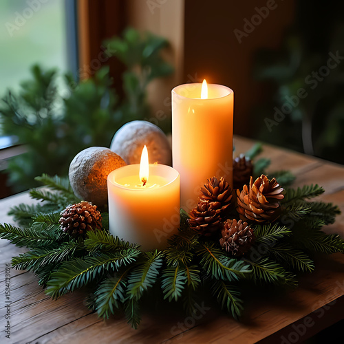 solstice, winter, altar, evergreen, pine cone, candle, renewal, light, ritual, sacred, nature, symbol, spirit, tradition, snow, frost, peace, stillness, hope, season, christmas, mystical, branch, celebration, glow, harmony, serenity, night, warmth