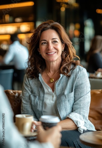 a woman CEO in a relaxed setting, such as a coffee shop or lounge area, engaging in a casual meeting with colleagues. Highlight her approachable demeanor while maintaining a professional appearance.