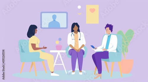 woman, doctor, appointment, health care, consultation, meeting, online, video, call, screen, medicals, patient, sitting, chair, room, office, interior, desk, table, plant, purple, blue, yellow, green, white, brown, digital, technology, professional, communication, service, care, diagnosis, treatment, modern, convenient, accessible