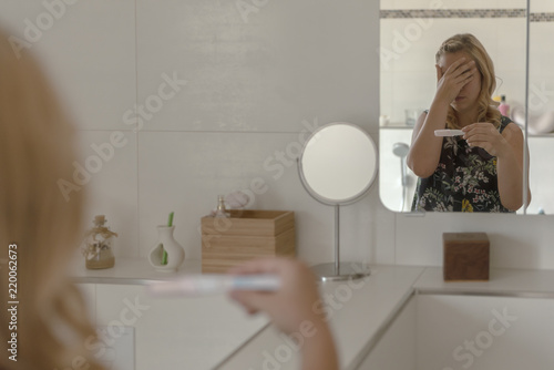 A woman controls a pregnancy test and is shocked by the result. Concept: health and hygiene