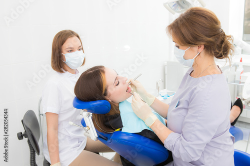 a woman dentist with an assistant treats a tooth to a woman in a modern dental clinic