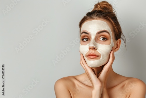 A woman displaying flawless skin showcasing her complexion after skincare treatment with hand under chin against a grey backdrop depicting beauty and self care