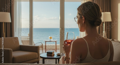 A woman enjoys a refreshing drink while gazing at the picturesque ocean view from her cruise ship cabin