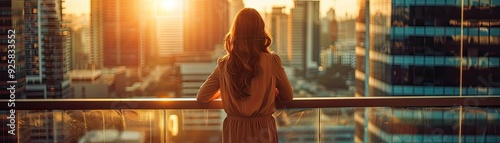 A woman gazes at the sunset over a city skyline, capturing a serene moment of reflection and beauty in an urban setting.